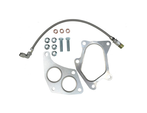 The kit is a bolt-on unit and is supplied with an AVO adjustable 15psi solid boost actuator, turbo stainless base and outlet gaskets, braided oil supply line, oil drain and oil drain gasket, water banjo bolts and banjo fittings, inconel studs, and fastening nuts.